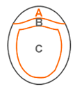 補強位置の定義につきまして、テンプレートにマーキングをなされていない場合は、こめかみに対してやや前側の場合はA、やや後ろからの場合Bの選択となります。 これは全体の長さに対する相対位置となりますので、詳細な指定はマーキングをお願いいたします。 |
